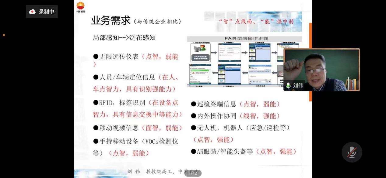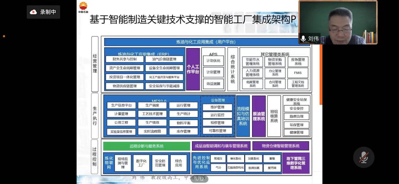 2022年10月26日下午,best365中国官方网站企业家讲坛在线上举行,本期论坛由best365中国官方网站主办。中国石油炼化板块智能化总体专家组顾问,大庆石化信息技术原中心主任、副总工程师、东北石油大学(自动化、计算机应用专业)兼职教授、研究生导师,教授级高级工程师刘伟应邀担当本期讲坛主讲专家,刘伟教授以“智能制造关键技术”为题,对石油石化企业在新一代信息技术应用于设计、生产、管理、服务等制造活动各个环节,如何缩短产品研制周期、降低资源能源消耗、降低运营成本、提高生产效率、提升产品质量等问题进行了阐述。计算机科学与信息技术学全体教师、相关学院部分教师和学院2019级、2020级部分员工聆听了讲座。
