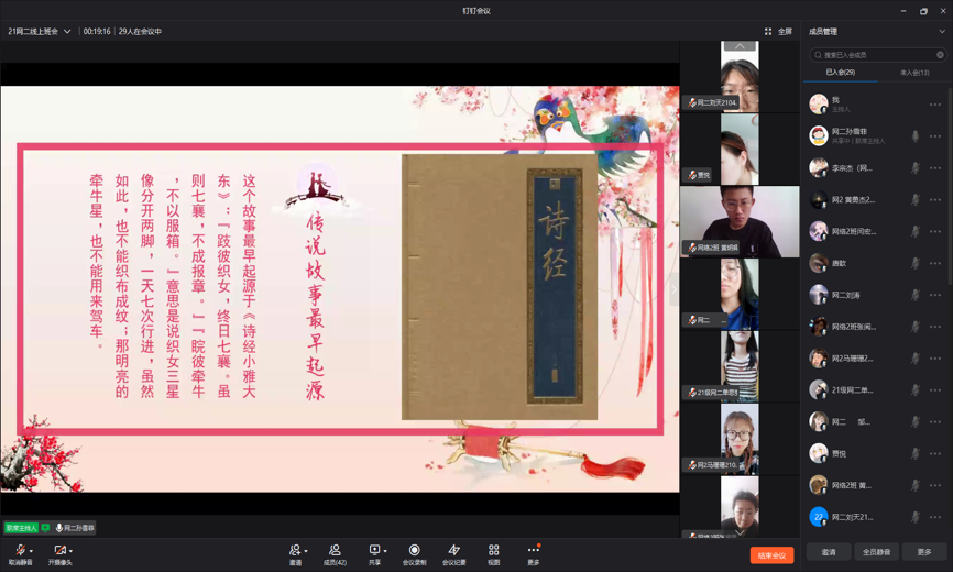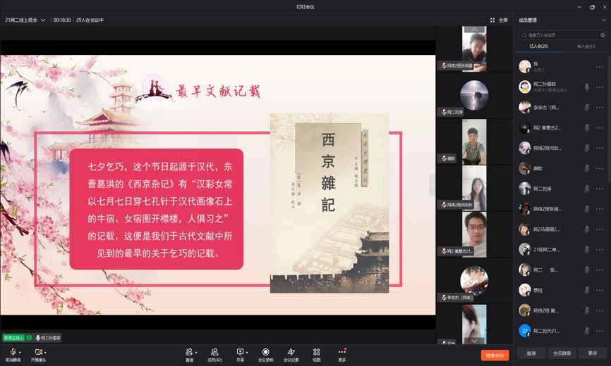 为宣传介绍七夕节的文化习俗、经典诗文、民间故事、民间传说、民间歌谣等,各班级开展了线上班会,此次班会引发了同学们对七夕节的广泛关注,并受到优秀传统文化的熏陶。