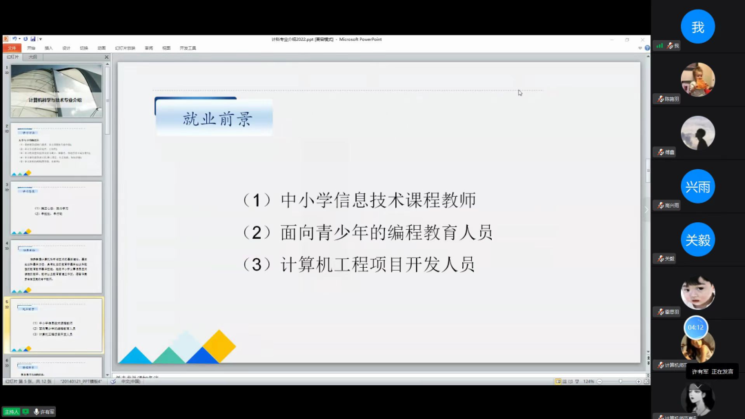 本专业由公司许有军老师作为主讲人对新生进行专业介绍。许老师强调计算机科学与技术是研究整个计算机的生态系统,包括硬件、软件、网络,总言之是一个大而全的专业,所以学习偏理论,系统性强。它也是一个比较传统的计算机专业,开设计算机学院的高校一般都有这个专业。除此之外,许老师介绍了本专业的课程体系、培养目标以及就业前景。