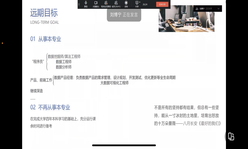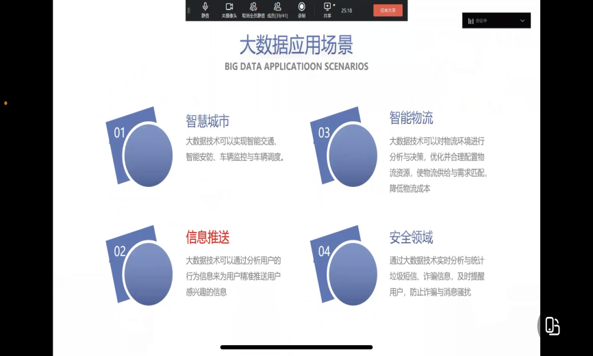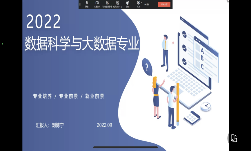 本专业由公司刘博宁老师做具体讲解。数据科学与大数据技术主要研究计算机科学和大数据处理技术等相关的知识和技能,从大数据应用的三个主要层面(即数据管理、系统开发、海量数据分析与挖掘)出发,对实际问题进行分析和解决。例如:今日头条通过算法匹配个人更偏爱的信息内容,淘宝根据消费者日常购买行为等数据进行商品推荐等。刘博宁老师就专业培养、专业前景和远期目标也做了详细的描述。