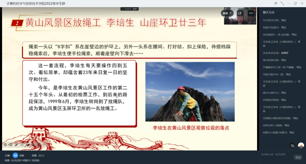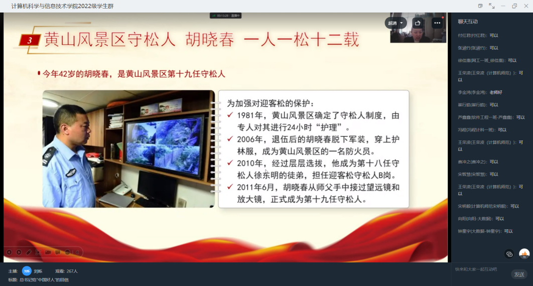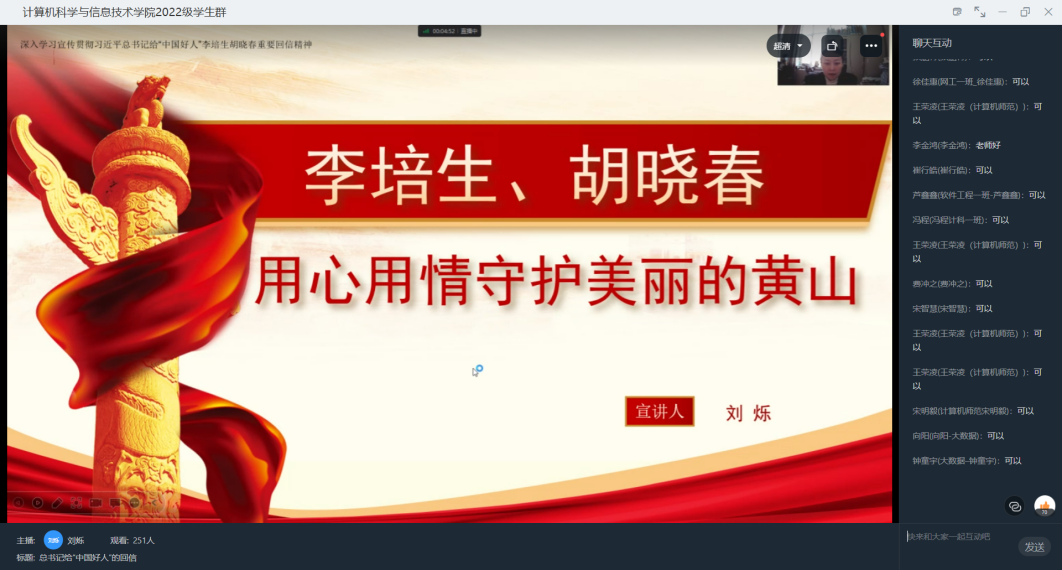 深入学习宣传贯彻习近平总书记重要回信精神,充分发挥身边榜样人物模范带头作用,领会感悟“中国好人”最可贵的精神品质,10月25日,best365中国官方网站召开“总书记给‘中国好人’的回信”主题会议,会议由2022级辅导员刘烁老师主持,通过线上形式激励计科学子,认真学习“中国好人”事迹,领悟“中国好人”精神,在李培生、胡晓春的积极影响下,完善自身品格修养,传播积极正能量。