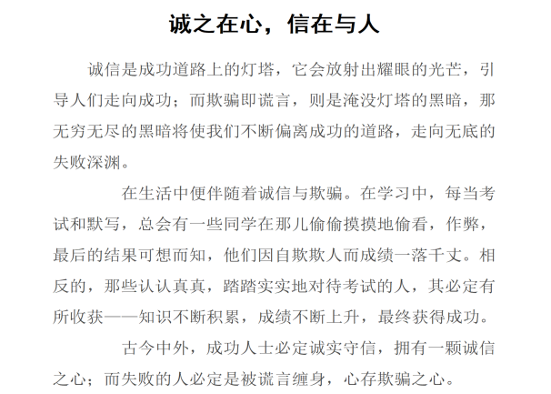 同学们根据此次教育活动写下自己的心得体会。同学们在文中写到要始终坚持以诚待人、以信做事,并表示:要想在社会上做一个合格的公民,最重要的是要树立好诚信意识,做一个诚实守信的人。诚信不仅仅停留在言语,更看重实际行动,相信同学们会躬行实践,知行合一。
