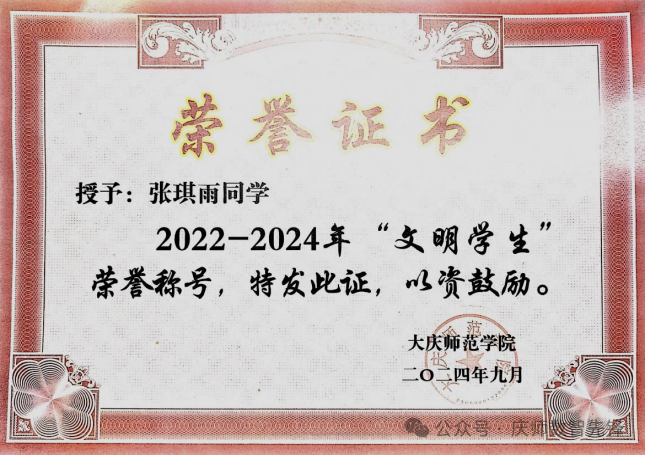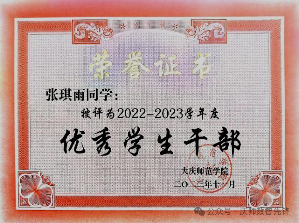 入学以来,张琪雨同学连续2年获得国家励志奖学金,连续3年获得校级一等奖学金。今年成功考取黑龙江八一农垦大学电子信息专业研究生。在校期间先后荣获“优秀共青团干部”、“优秀员工干部”、“铁人式优秀共青团干部”、“文明员工”等荣誉称号。