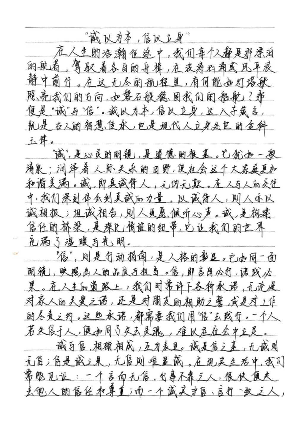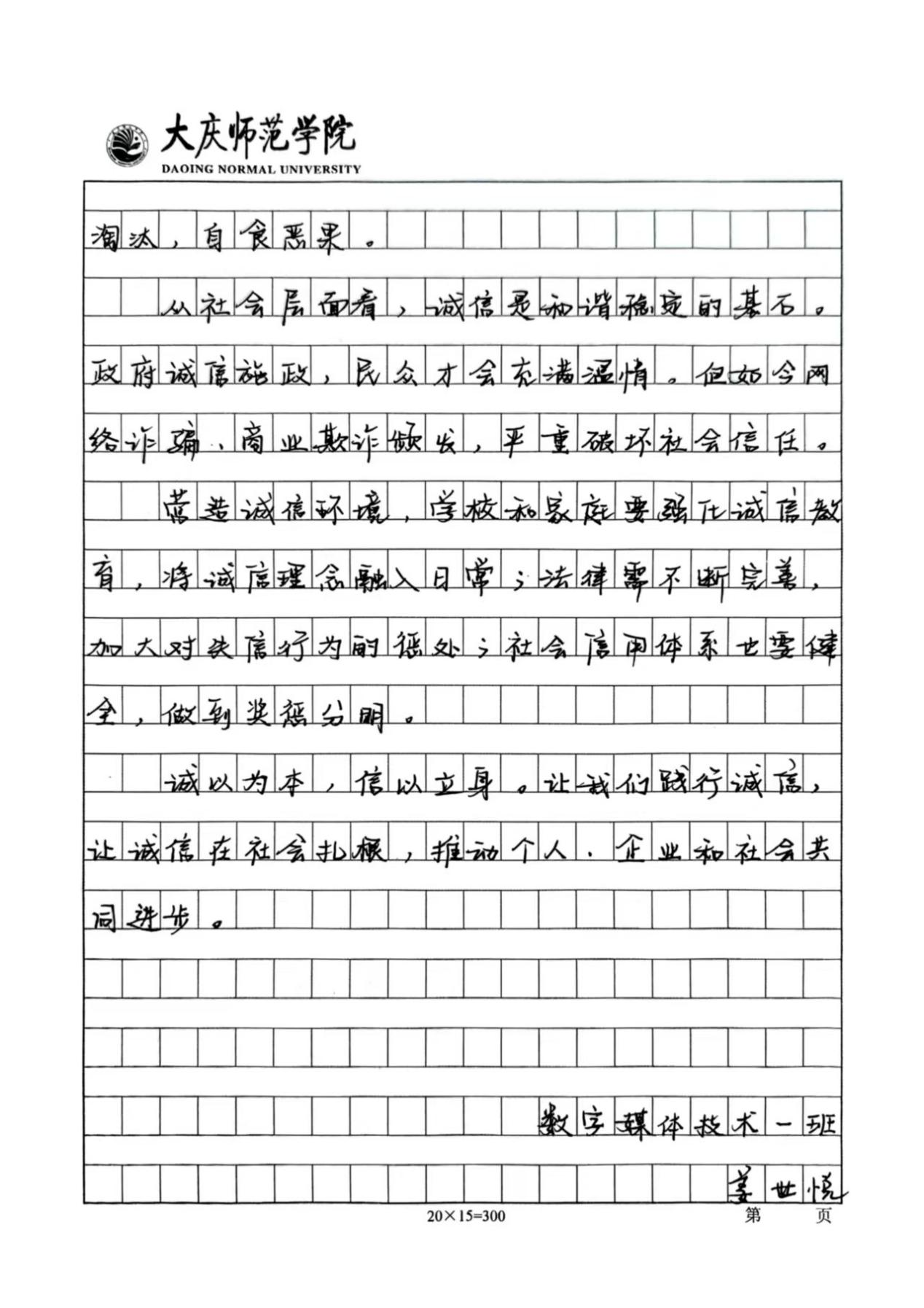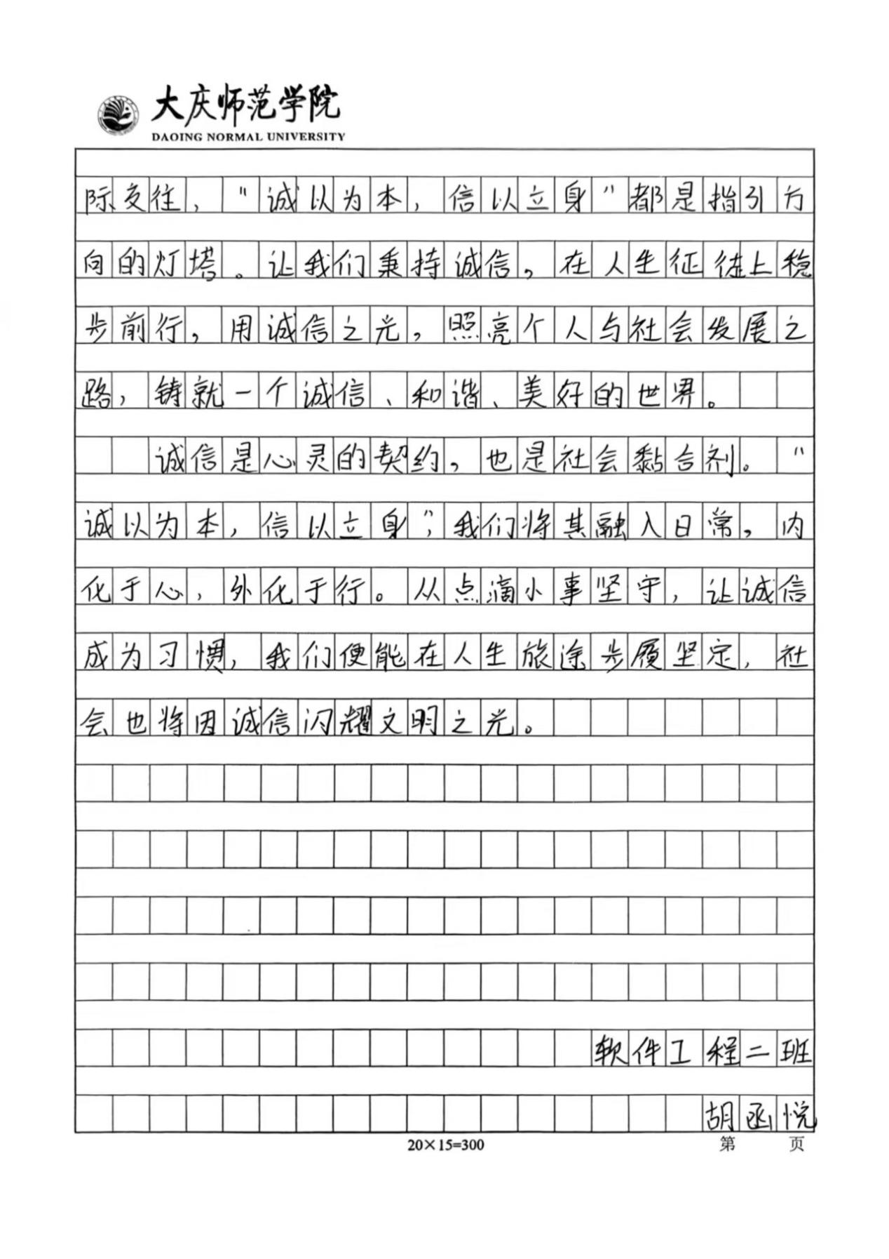 活动开展期间,同学们踊跃报名,积极参与本次活动。他们结合主题内容,用笔墨书写出诚信对于人格塑造的重要性。通过举例论证、引用典故等手法,诠释了诚信的意义,展现了当代老员工对诚信的认知。同时,以本次活动作为载体,传播诚信价值观,营造“人人讲诚信、事事守信用”的浓厚校园氛围,使计科学子在诚信品格的滋养中筑牢人生根基,为构建文明和谐的校园生态注入精神动力。