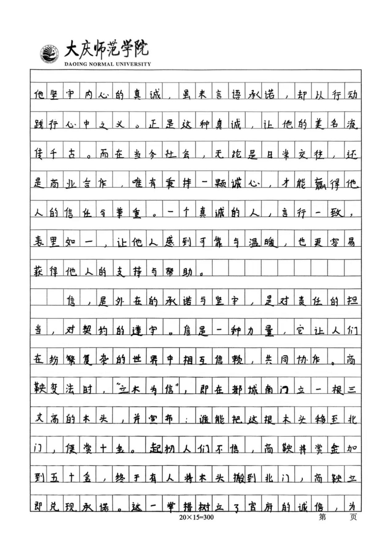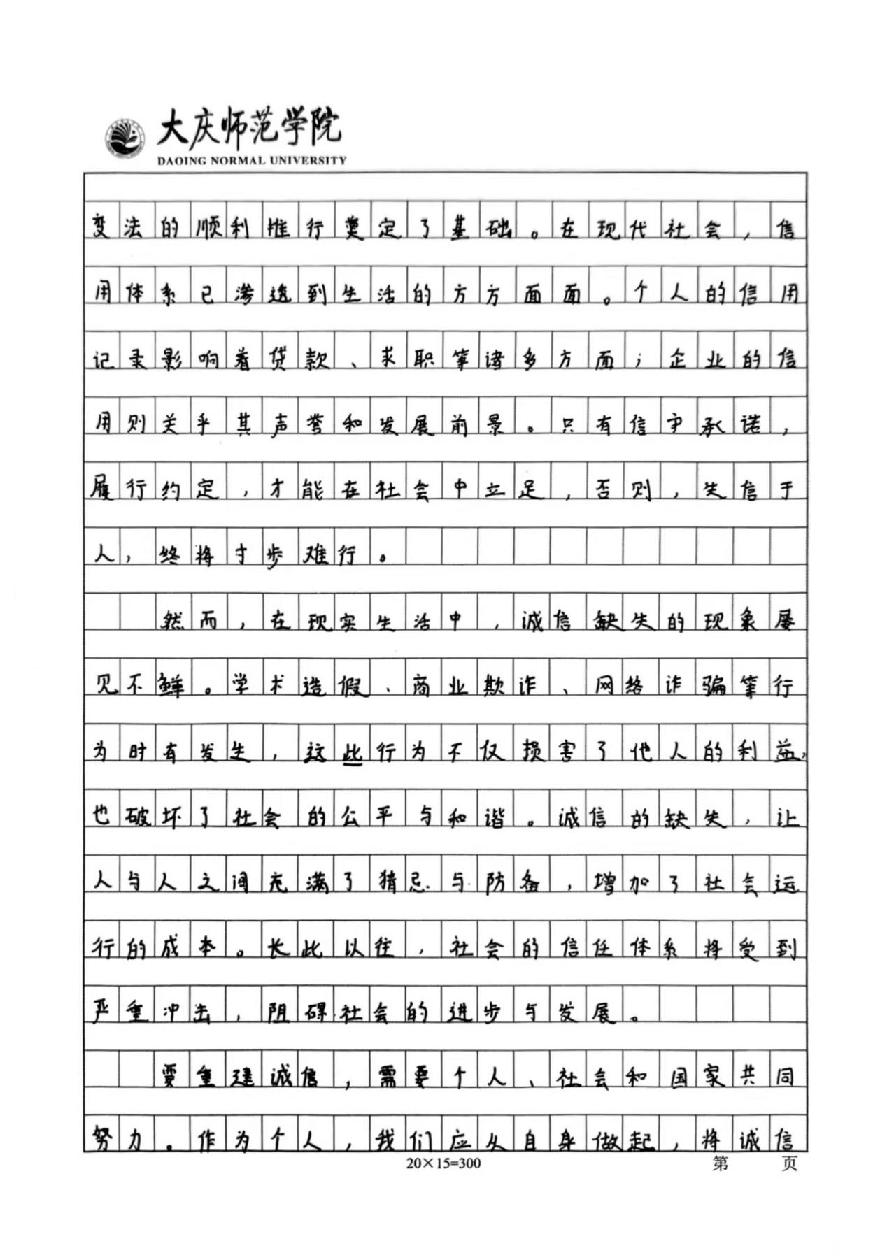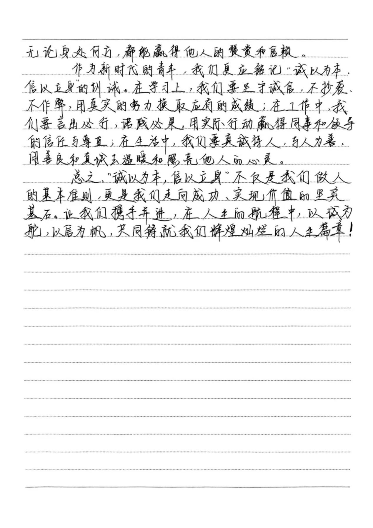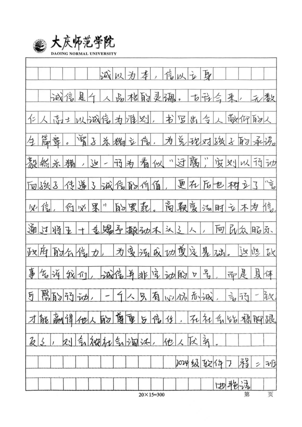 活动开展期间,同学们踊跃报名,积极参与本次活动。他们结合主题内容,用笔墨书写出诚信对于人格塑造的重要性。通过举例论证、引用典故等手法,诠释了诚信的意义,展现了当代老员工对诚信的认知。同时,以本次活动作为载体,传播诚信价值观,营造“人人讲诚信、事事守信用”的浓厚校园氛围,使计科学子在诚信品格的滋养中筑牢人生根基,为构建文明和谐的校园生态注入精神动力。
