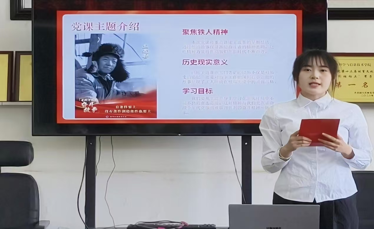 员工党员许茹楠带领大家系统回顾中国石油工业发展历程,从孙健初1937年穿越戈壁发现玉门油田打破“贫油论”,到王进喜少年背油、玉门创月进尺5009米全国纪录;从1960年大庆会战“没有条件创造条件也要上”的誓言,到他带伤跳泥浆池制服井喷铸就“铁人”丰碑,展现石油人矢志报国、攻坚克难的奋斗精神。呼吁全体员工党员在日常工作中践行全心全意为人民服务宗旨;在实践活动中以进喜奋斗姿态带头参加学科竞赛、志愿服务;在学风建设中做表率,在集体生活中树正气,让大庆精神与铁人精神转化为激励身边同学的生动实践,做精神传承的践行者,勇担时代使命。