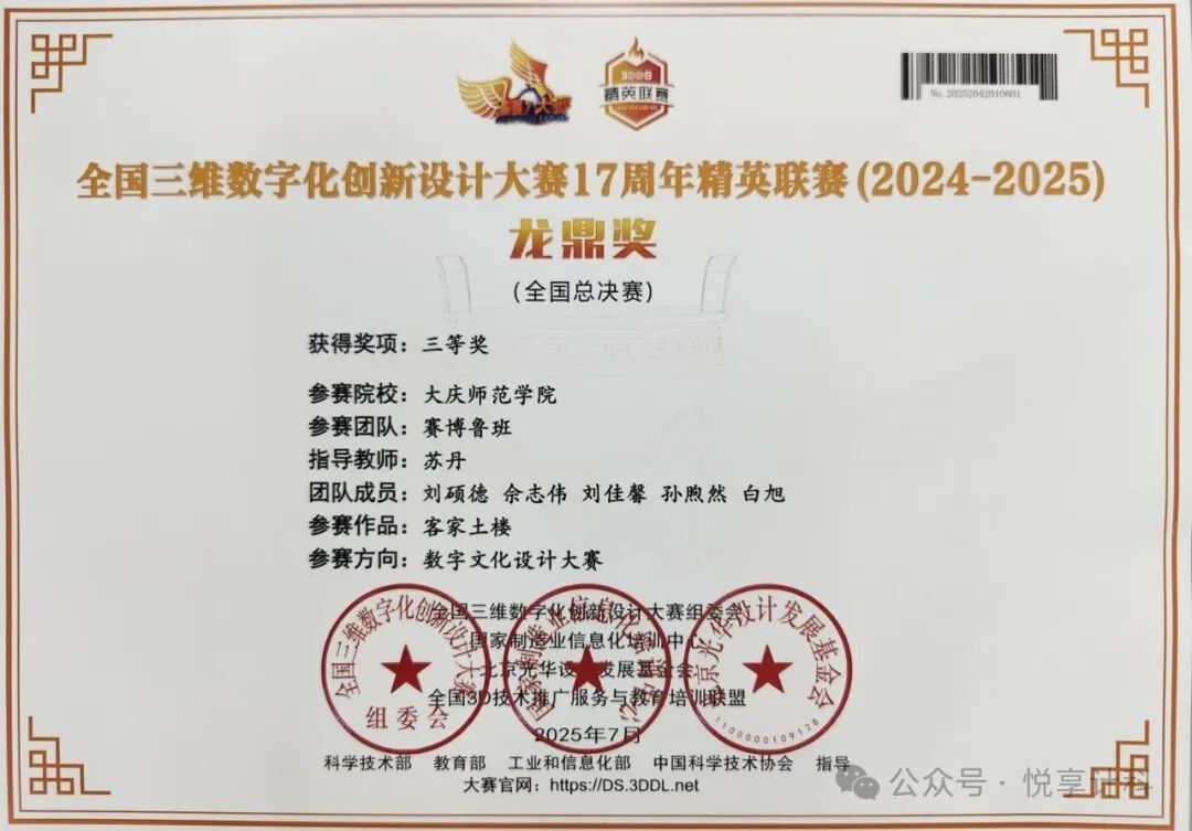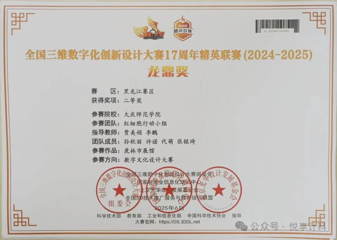 竞赛是 DMT 社团检验学习成果、展现团队实力的重要舞台。社团积极组织成员参与各类专业赛事,其中在全国三维数字化创新设计大赛 17 周年精英联赛(2024 - 2025)中表现格外耀眼。在黑龙江赛区的激烈角逐中,DMT 社团成员凭借扎实的专业知识、出色的创意构思以及紧密的团队协作,一举斩获特等奖一项、一等奖一项、二等奖一项的佳绩。这些奖项不仅是对社团成员努力付出的高度认可,更是社团在数字创作领域教学与实践成果的有力证明。