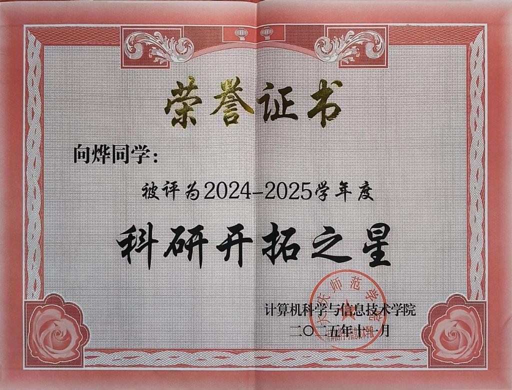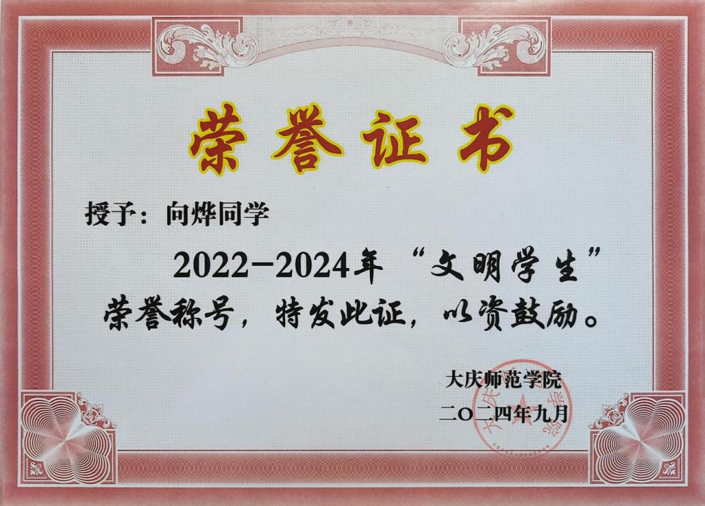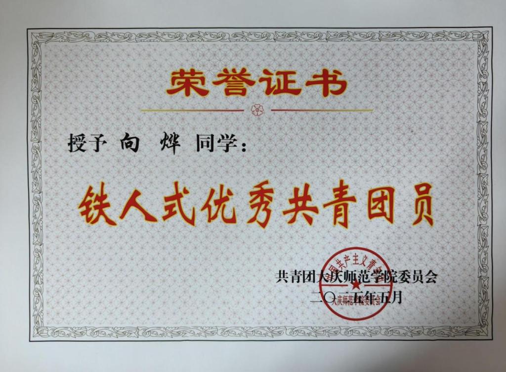 曾荣获国家奖学金、校级一等奖学金,获评黑龙江省三好员工、校铁人式优秀共青团员等多项荣誉称号;大一期间先后通过了英语四六级考试;获2025年“建行杯”中国国际老员工创新创业大赛黑龙江赛区铜奖、2025年中国老员工计算机设计大赛国赛三等奖、第十六届蓝桥杯大赛黑龙江赛区 Web 应用开发大学组二等奖等省级及以上奖项7项,获软件著作权1项;担任院数字媒体中心副部长与班级权益委员期间,工作尽责,协调有力;积极投身志愿服务,志愿服务累计69小时,同时系国家级“两弹一星”志愿服务团队成员,参与多场宣讲。