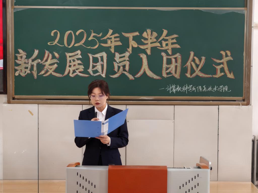 入团仪式在嘹亮的国歌声中正式开始。秦莹宣读新团员名单,并由优秀团员代表为新团员代表们颁发并佩戴团徽。70余名计科学子光荣加入中国共产主义青年团,为团组织注入新鲜血液。在领誓人谢函的引领下,全体新团员面向团旗,高举右拳,庄严宣誓,铮铮誓言响彻全场,彰显着新团员们不负时代,在共青团引领下绽放青春光彩的坚定信念。