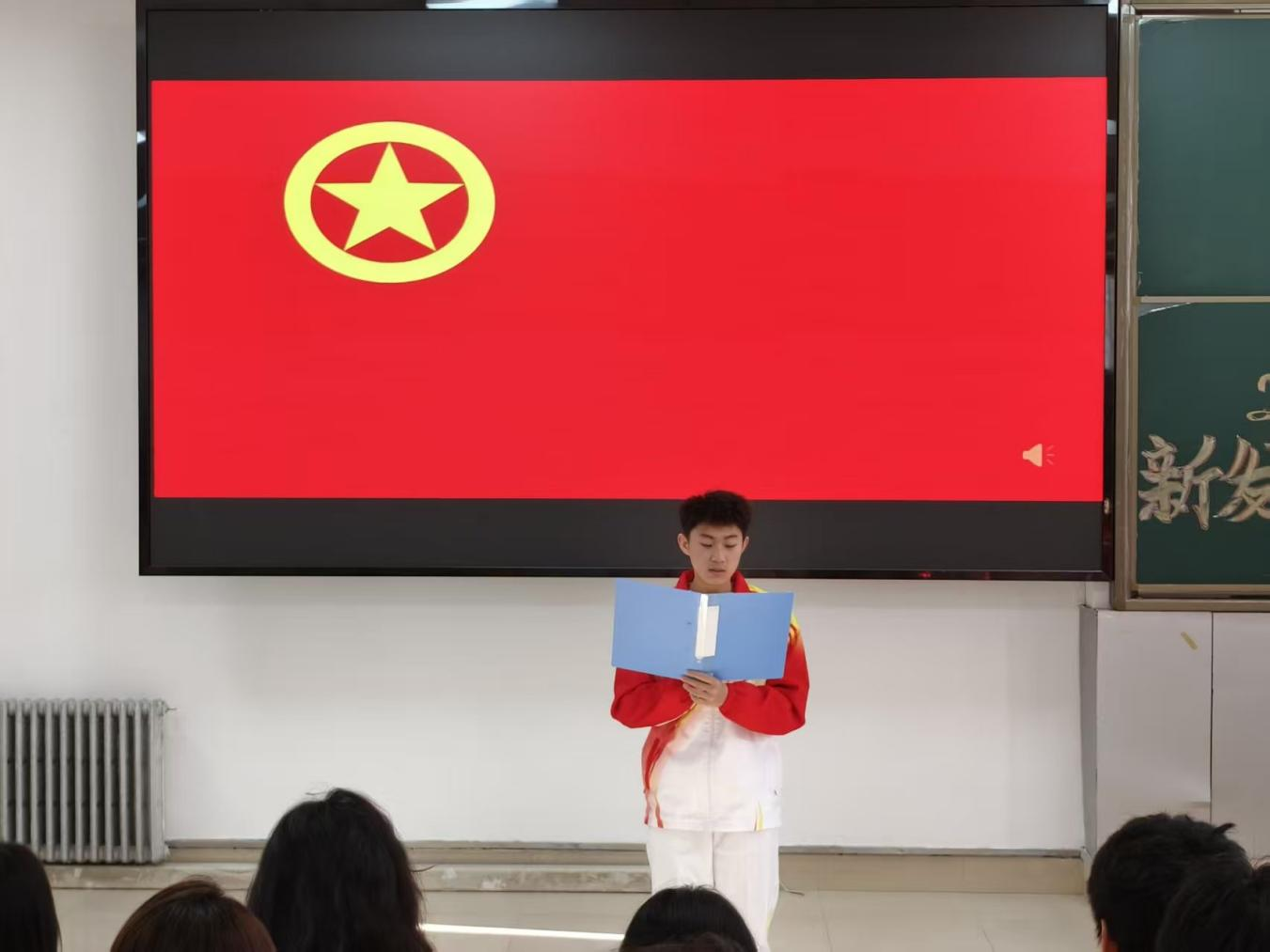宣誓完毕,新团员代表张东旭同学上台发言,表达了对团组织的无限向往和为团争光的坚定决心。他表示入团是荣誉更是责任,将牢记入团誓言,坚守理想信念,厚植爱国情怀,立志为国家发展献力、为团组织争光。随后,优秀团员代表赵婉宁同学勉励新团员牢记入团初心,坚定理想信念,勤学善思,以青春之姿勇担使命,以实干践行誓言,在成长路上锤炼品格,为团组织发展贡献青春力量。