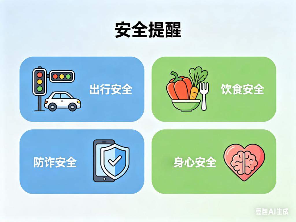 3.防诈安全:假期诈骗手段层出不穷,接到“退款”“熟人借钱”等电话请多核实、多查证,谨防财产损失。