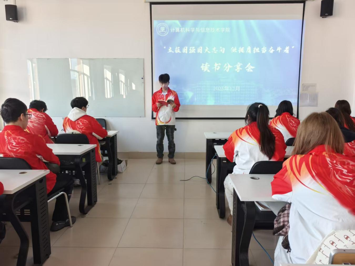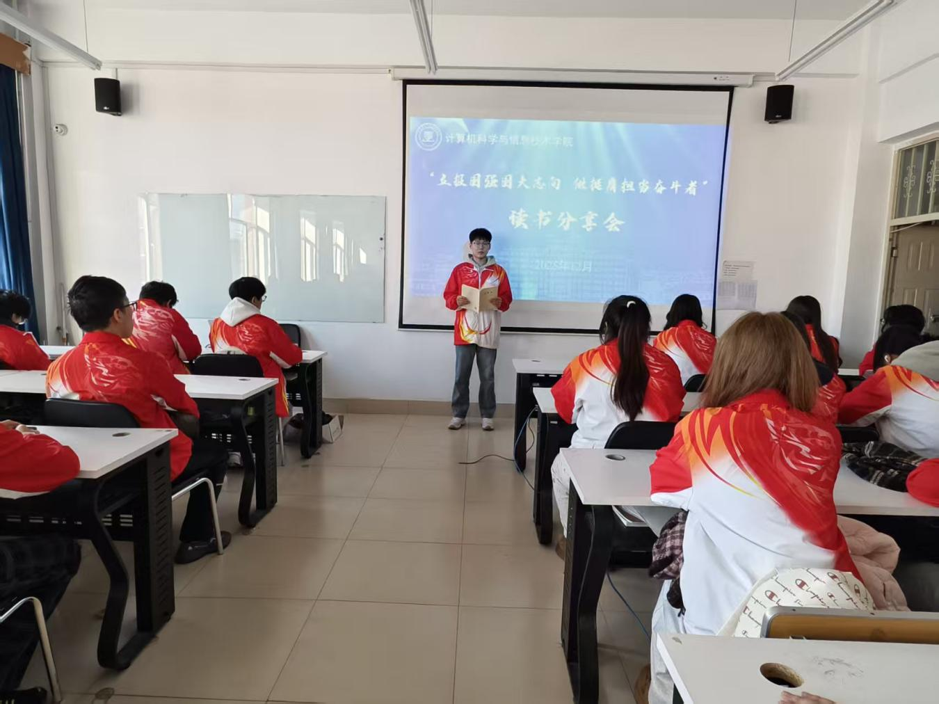 读书会上,各班围绕“立报国强国大志向 做挺膺担当奋斗者”主题分享交流。同学们品读经典,涵养家国情怀、立下报国大志,从书中体悟奋斗精神与初心力量;通过共读明晰方向、凝聚共识,将书中智慧转化为行动动力。让计科学子深刻理解“报国”“奋斗”的意义,坚定了以青春力量建设国家、以实际行动践行担当的信念。